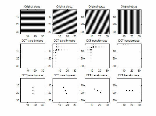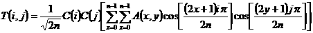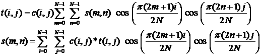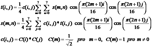 F(u,v) je vzorec přímé DFT a f(x,y) je vzorec zpětné DFT dle [17]. Tato transformace ale má nevýhodu, že F(u,v) je komplexní funkce (tedy má reálnou a imaginární část) ale využívá jen reálné členy. Proto výsledek zabere v paměti dvojnásobek místa. Proto vznikly způsoby výpočtu, které vedou k optimalizaci. Diskrétní kosinová transformace (DCT) vychází z diskrétní Fourierovy transformace (DFT), která převádí časový obraz signálu na frekvenční spektrum, ve kterém se obraz lépe analyzuje. DCT obsahuje pouze reálnou část komplexního spektra a proto zabírá při výpočtu v paměti poloviční místo oproti diskrétní Furierově transformaci. Dle [4] slouží pro výpočet DCT pro dvourozměrný čtvercový signál s (obraz) vzorec: