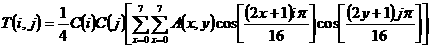 Vzorec pro výpočet DCT se také velmi často zapisuje již přímo ve tvaru pro matici o velikosti 8x8, jeho tvar pak je: