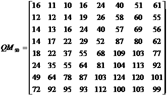 Matice T obsahuje tzv. DC koeficienty tvořící frekvenční mapu. Při kompresi se využívá toho, že lidské oko není citlivé na vysoké frekvence. Amplitudy těchto frekvencí jsou umístěny v pravém dolním rohu matice. Naopak nejnižší frekvence jsou v levém horním rohu. Prvek T(0,0) udává střední hodnotu celého transformovaného obrazu a má největší vliv na celková obrazová data v matici. Pro kompresi se pak používá tzv. kvantizační matice. Skupina JPEG definovala optimální kvantizační matici, která respektuje anatomii lidského oka a měla by znamenat rovnováhu mezi kvalitou a mírou komprese. Tato matice má největší hodnoty právě v místech, kde jsou vysoké frekvence. Má tvar