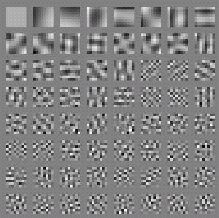 Obrázek 3. – porovnání bázových vektorů KLT (nalevo) a DCT (napravo)