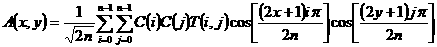 Vstupní data v případě digitálního obrazu je dvourozměrná matice A(x,y) o x sloupcích a y řádcích. Výstupem je matice T(i,j) o stejném rozměru jako matice A. DCT se spočítá podle vzorce